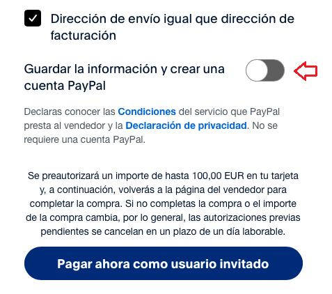 Una vez rellenados los campos socilitados, deseleccione el botón de crear cuenta de paypal si no le interesa, y pulse