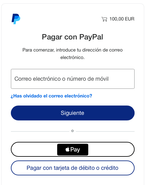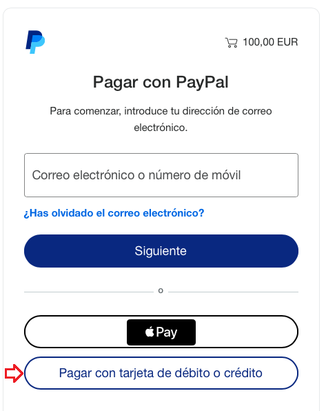Si NO tiene cuenta en Paypal, pulse "Pagar con tarjeta de débito o crédito" y seguir las instrucciones que se le indiquen. También puede pagar mediante Apple Pay.