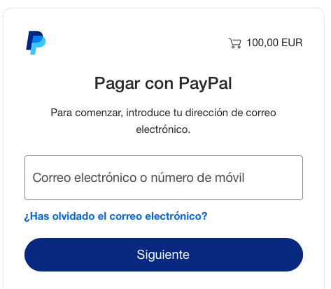 Introduzca su correo electrónico y pulse "Siguiente" para iniciar sesión en Paypal y proceder al pago siguiendo el procedimiento que se le indique.